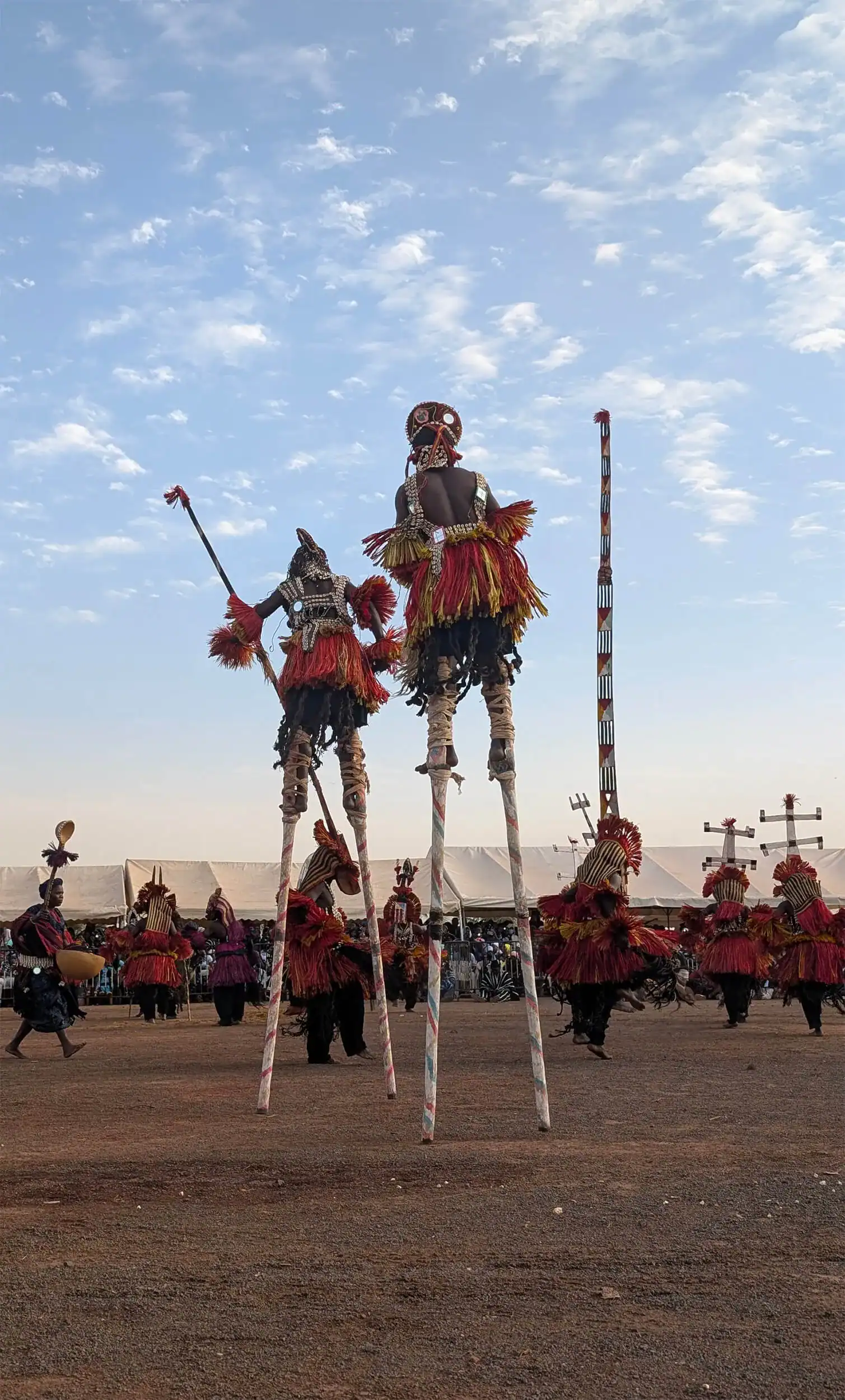 Today’s city tour of Mopti reveals why it’s called the Venice of Mali, with its location surrounded by the Niger and Bani rivers. You will see the Komoguel adobe mosque, walk around the old town, and explore the busy fishing port. See pirogues being made and the market where various ethnic groups such as Bambara, Bobo, Bozo, Dogon, Fulani, Tuareg and Songhays trade goods. The day ends with a sunset sail on the Niger River in a traditional pirogue, visiting the Bozo fishing tribe on an island. You’ll meet the local chief and people before returning to the mainland.